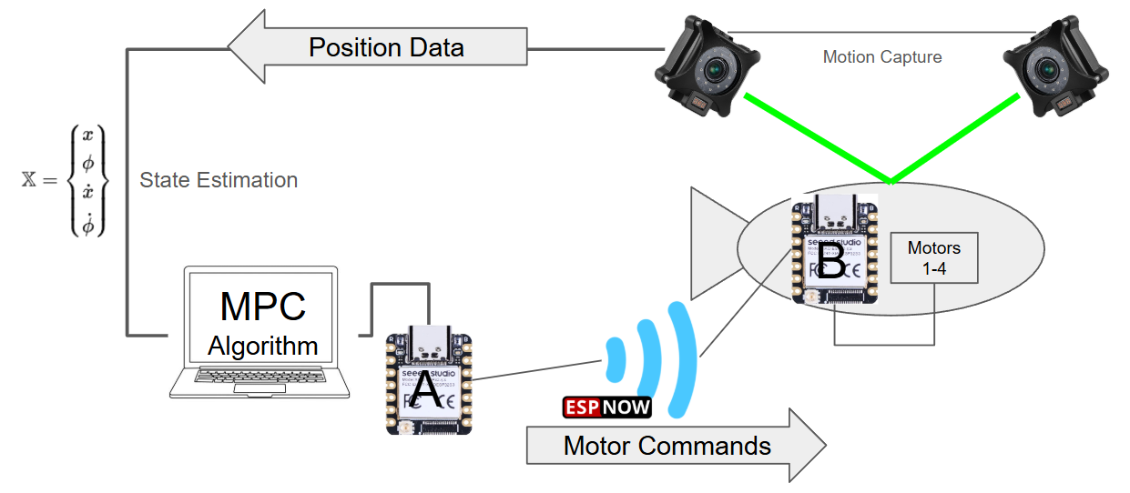 This setup enabled us to test various control strategies — PID, LQR, and Model Predictive Control (MPC) — without relying on onboard sensors or heavy computing hardware.