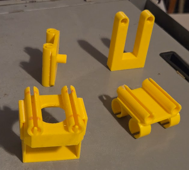 First batch of printed parts — carriage and motor mounts, pully idler, and frame brackets test half